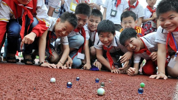 The third toy was “玻璃球 (bō li qiú = marbles)” or “波珠 (bō zhū = wavy bead). Marbles were very popular 流行 (liú xíng) among children because they were bright, crystalline, and easy to swallow (I’m joking, don’t do that). We played different games using marbles. In one game, we would dig a hole in the sand and then take turns trying to hit each other’s marbles into the hole until only one marble remained. The owner of this marble would be the winner 赢家 (yíng jiā).