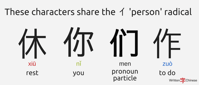 Now let’s have a look at the left side of all four characters. You can probably see that what they all have in common is this: 亻(rén). This is a radical meaning ‘person’. The ‘person’ radical is also the standalone character 人, the radical is just turned slightly on its side.