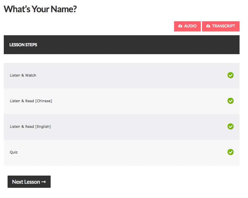 Once you get to the quiz section, you’ll watch the video for the last time without any subtitles, then scroll down to complete the quiz. Once you’re done, you can check the step as ‘complete’ and move onto your next lesson!