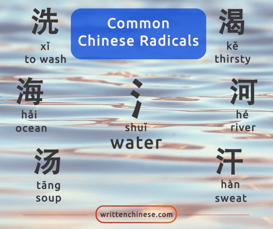 Chinese characters can often be broken up into smaller pieces, or “radicals.” These radicals can give clues to a word’s meaning and pronunciation. One of the easiest radicals to spot in Chinese is 氵 三点水 (sān diǎn shuǐ), or the water radical.