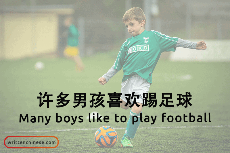 Example: 许多男孩喜欢踢足球。(xǔduō nánhái xǐhuan tī zúqiú) Many boys like to play football.