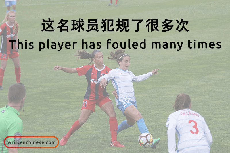 Example: 这名球员犯规了很多次。(zhè míng qiúyuán fànguīle hěnduō cì) This player has fouled many times.