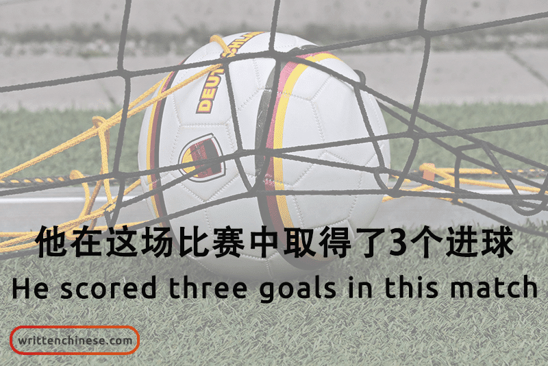 Example: 他在这场比赛中取得了3个进球。(Tā zài zhè chǎng bǐsài zhōng qǔdéle 3 gè jìn qiú) He scored three goals in this match.