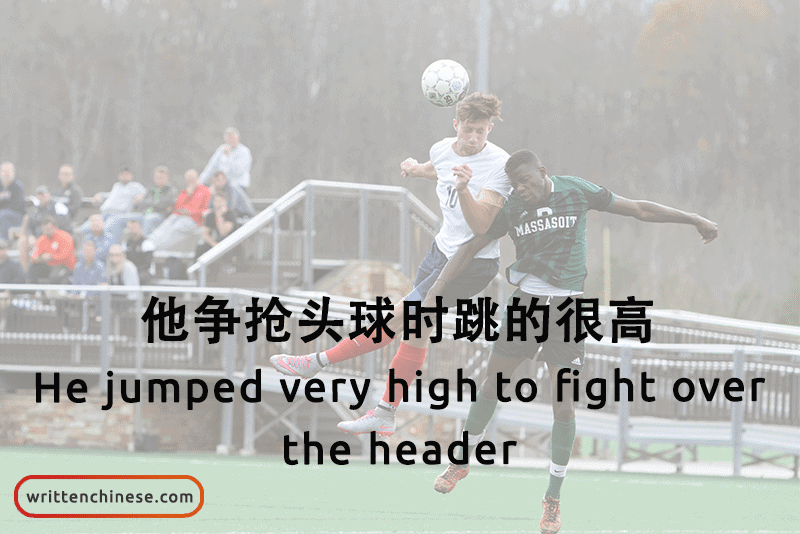 Example: 他争抢头球时跳的很高。(Tā zhēng qiǎng tóu qiú shí tiào de hěn gāo) He jumped very high to fight over the header.
