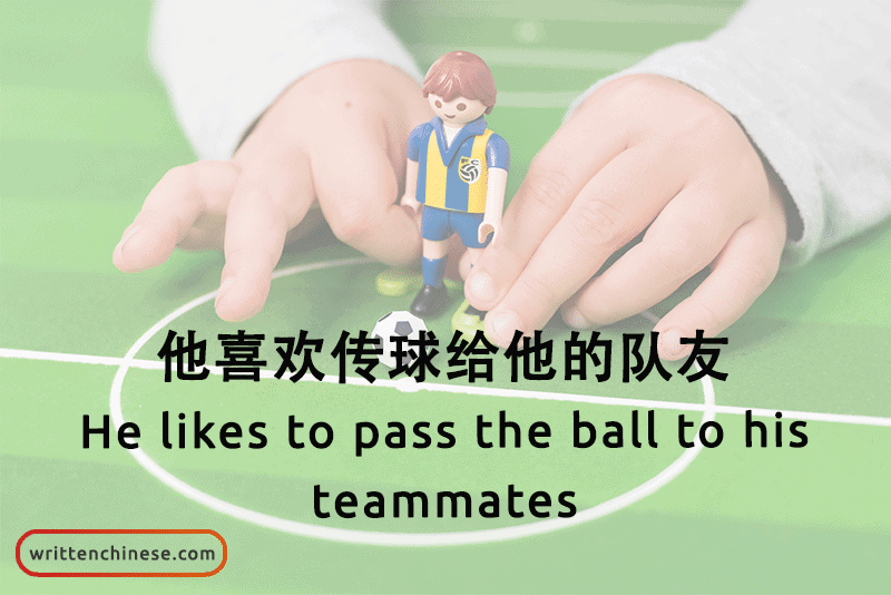 Example: 他喜欢传球给他的队友。(tā xǐhuan chuán qiú gěi tā de duìyǒu) He likes to pass the ball to his teammates.