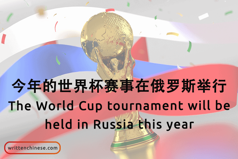 Example: 今年的世界杯赛事在俄罗斯举行。(jīnnián de shìjièbēi sàishì zài é luó sī jǔxíng) The World Cup tournament will be held in Russia this year.