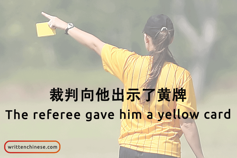 Example: 裁判向他出示了黄牌。(Cáipàn xiàng tā chūshìle huángpái) The referee gave him a yellow card.