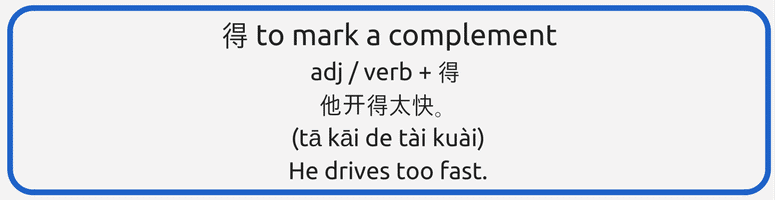 得 (de) can be quite challenging to learn, as there is no English equivalent. Follow this sentence pattern to use the 得 (de) particle: