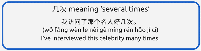 我访问了那个名人好几次。(wǒ fǎng wèn le nèi gè míng rén hǎo jǐ cì) I’ve interviewed this celebrity many times.