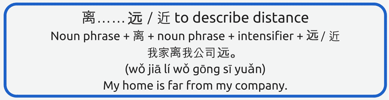 离 (lí) means ‘apart’ or ‘away from’. 远 (yuǎn) means ‘far’ and 近 (jìn) is ‘near’.