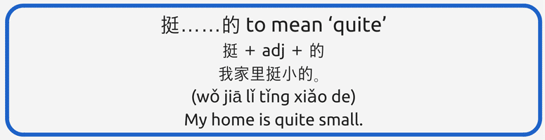 我家里挺小的。(wǒ jiā lǐ tǐng xiǎo de) My home is quite small.