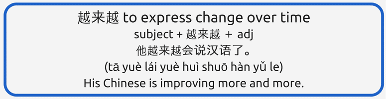 他越来越会说汉语了. (tā yuè lái yuè huì shuō hàn yǔ le) His Chinese is improving more and more.