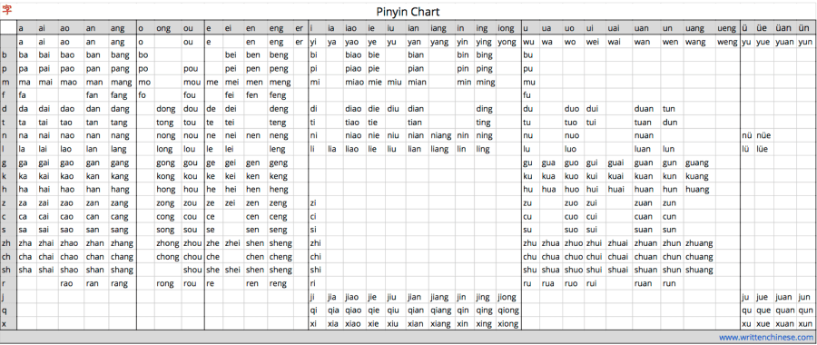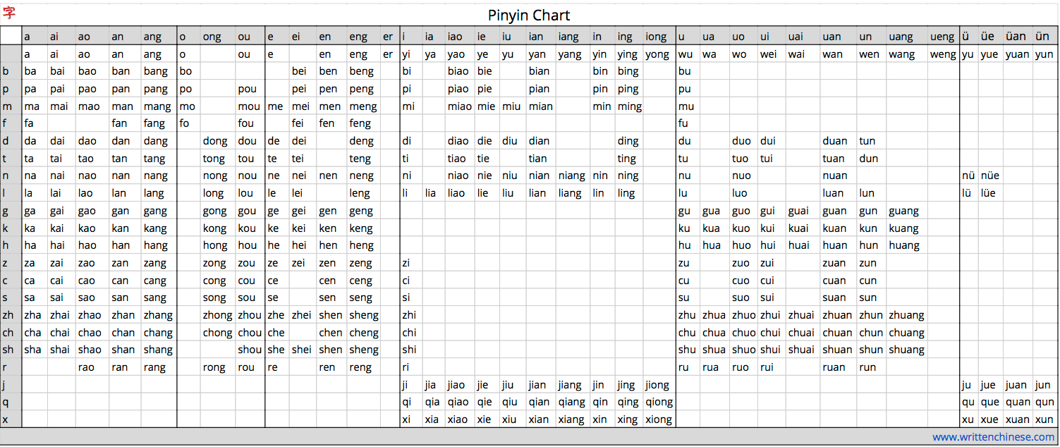 As I mentioned in the introduction, even though pinyin uses the Latin alphabet, the pronunciation is not the same as its romanized counterpart, and it is IMPOSSIBLE to learn Chinese without listening to it and speaking it. You can take a look at the Pinyin chart below and see all the different sounds in the Chinese language.
