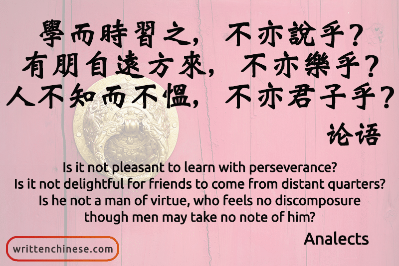 (zǐ yuē xué ér shí xí zhī, bù yì shuì hū? yǒu péng zì yuǎn fāng lái, bú yì lè hū? rén bù zhī ér bù yùn, bù yì jūn zi hū?)