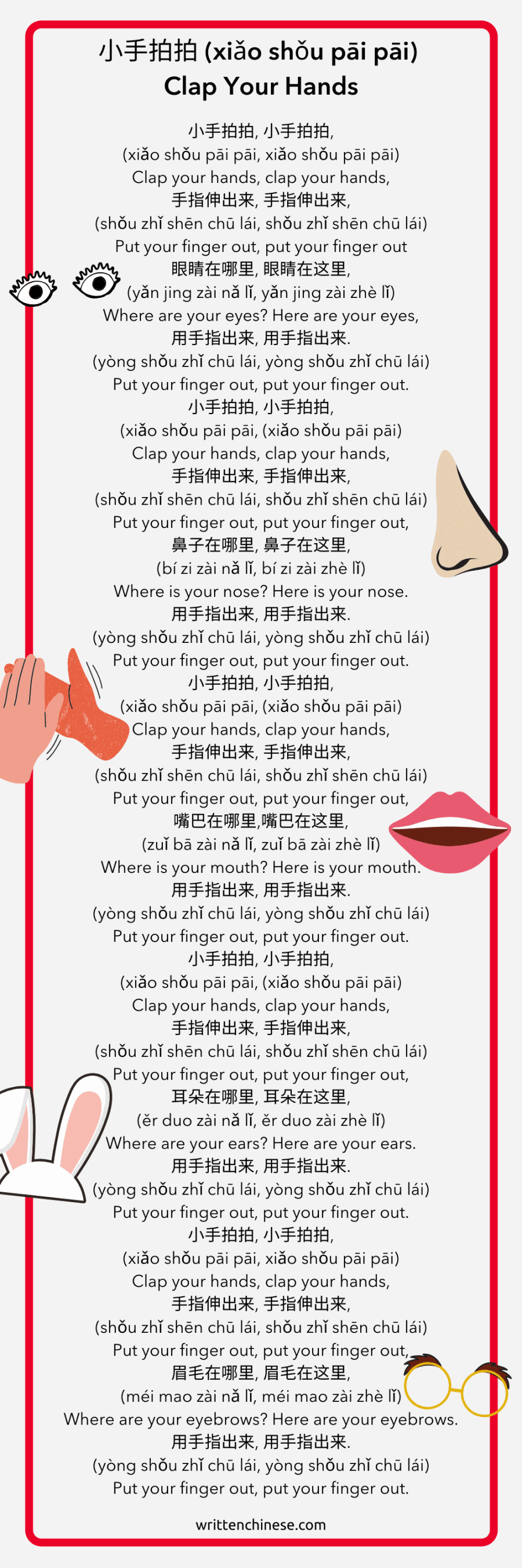 Sometimes, 耳朵 or ‘ears’ are replaced by 眼睛 ‘eyes’ in some versions of this song.