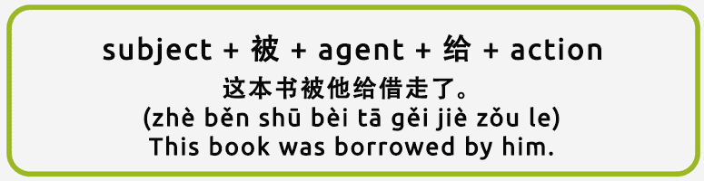这本书被他给借走了。 (zhè běn shū bèi tā gěi jiè zǒu le)