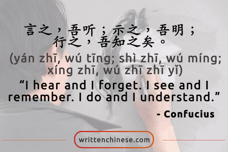 Although I’m sure not everyone will agree that it’s easier to forget from listening, however, ‘doing’ something is probably the best way to remember and understand. You can use this quote when thinking about studying Chinese characters. Actually writing characters help remember them and understand the character more fully.