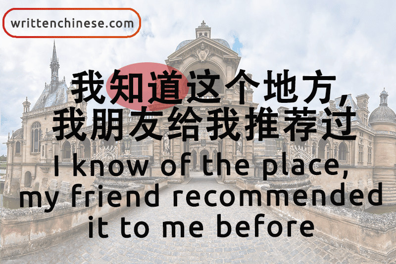 (4) 我知道这个地方,我朋友给我推荐过。(wǒ zhī dao zhè ge dì fang, wǒ péng you gěi wǒ tuī jiàn guò.) = I know of the place, my friend recommended it to me before.