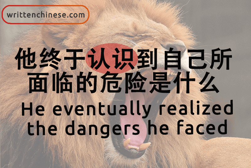 (5) 他终于认识到自己所面临的危险是什么。(tā zhōng yú rèn shi dào zì jǐ suǒ miàn lín de wēi xiǎn shì shén me.) = He eventually realized the dangers he faced.*