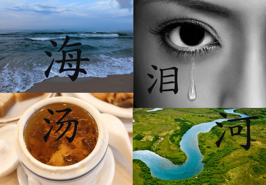 Chinese characters can often be broken up into smaller pieces, or “radicals.” These radicals can give clues to a word’s meaning and pronunciation. One of the easiest radicals to spot in Chinese is 氵 三点水 (sān diǎn shuǐ), or the water radical.